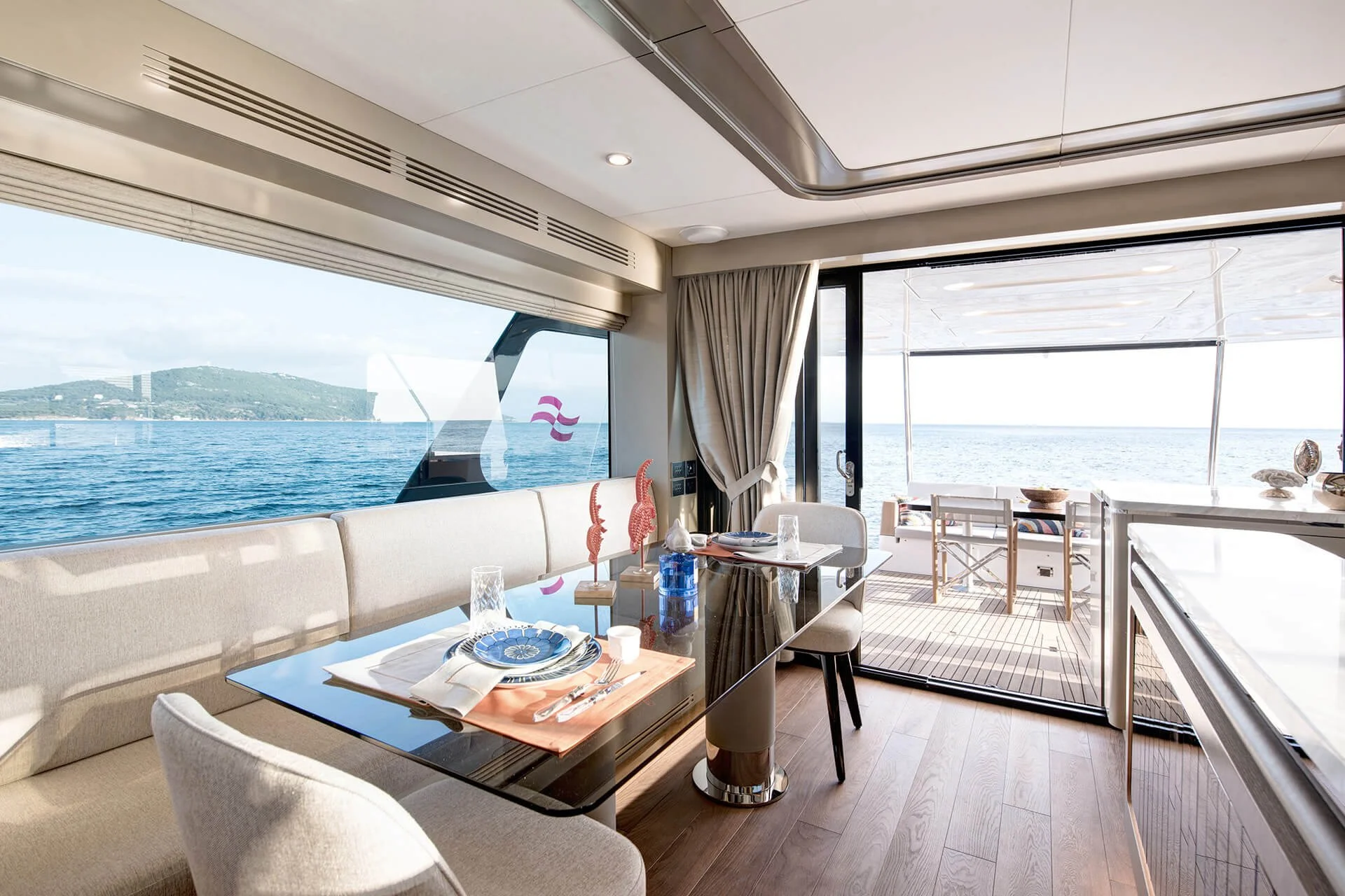 The light honey-colored wood and soft semi-gloss lacquer embrace you as you enter the salon. This warm and inviting atmosphere makes you feel right at home. Accents of cognac leather complete the warm and inviting look, creating the perfect atmosphere for making memories on the water with family and close friends.