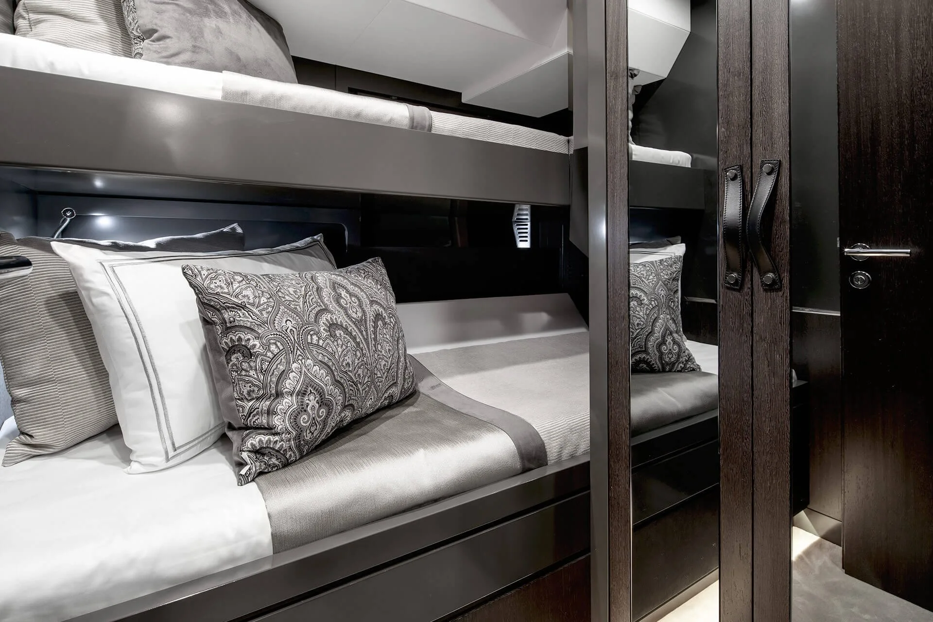 The bold dark wood and anthracite lacquer create a very masculine and energetic look without being heavy A high contrast is created by the use of the finest white leathers and fabrics, resulting in an interior that feels stylish, yet contemporary and encourages you to push your limits... This modern look feels like an open loft and harmonizes with the colors of the yacht’s exterior