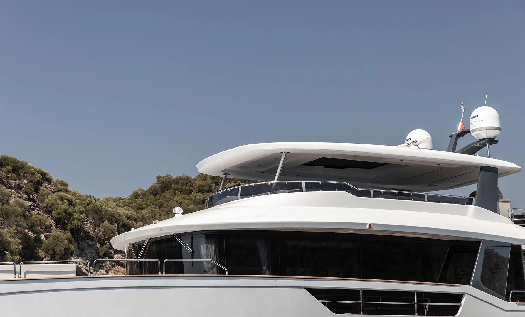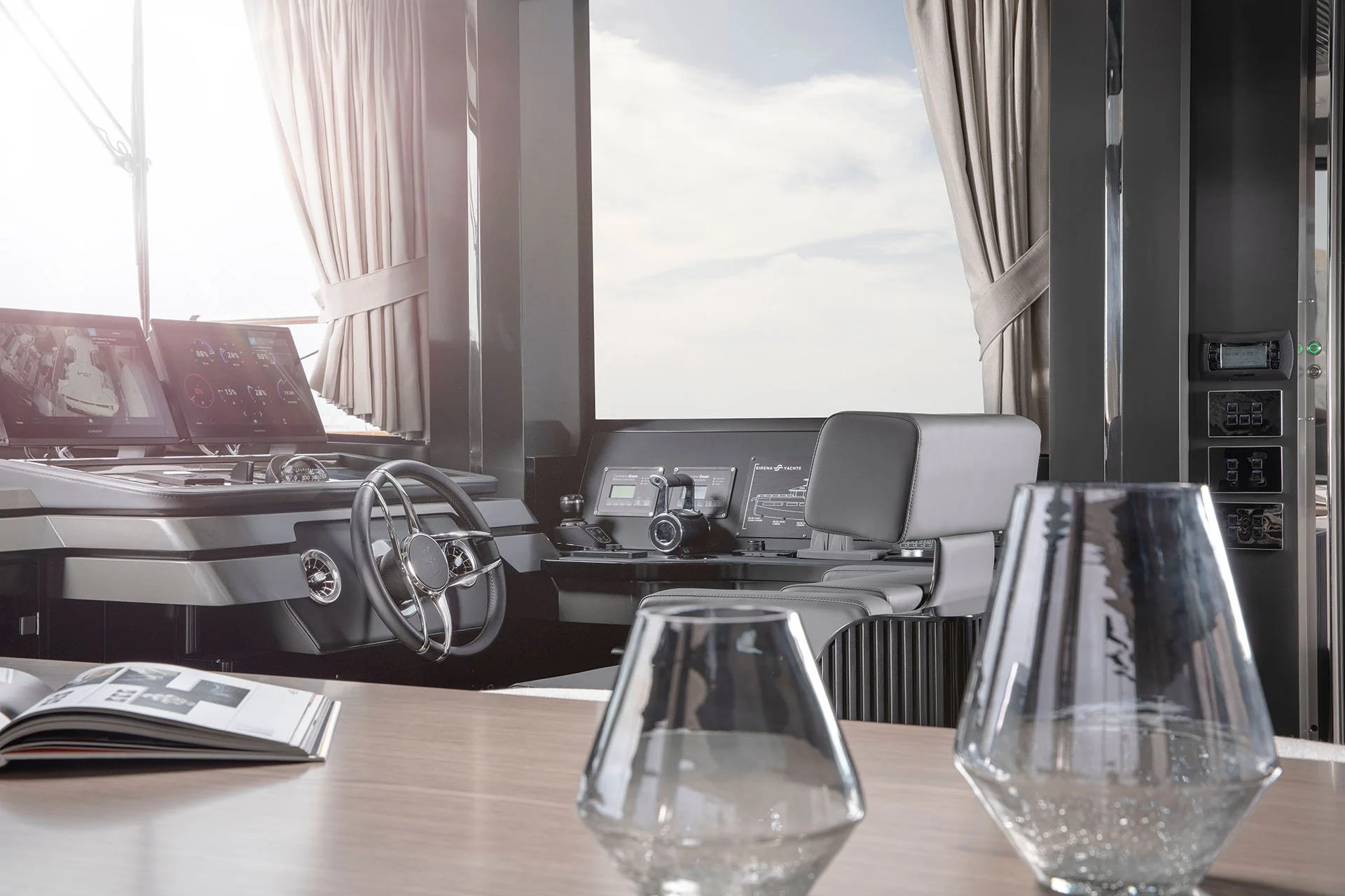 The Sirena 78 takes the flybridge several steps further into the concept, and it starts with enormous windows that allow the natural light and views, yet block wind, spray, and weather. First off, there’s the luxury of choice: Owners can opt for an open flybridge, a semi-enclosed one, or a fully enclosed design, and each offer specific attributes.