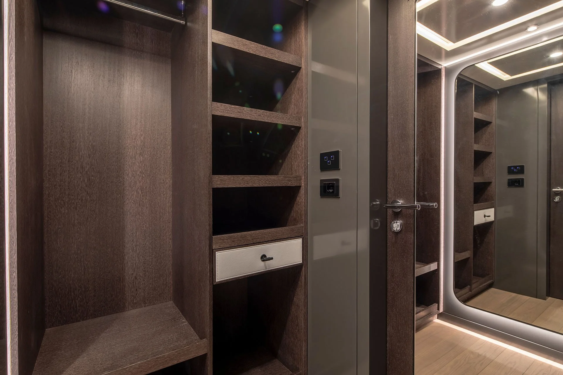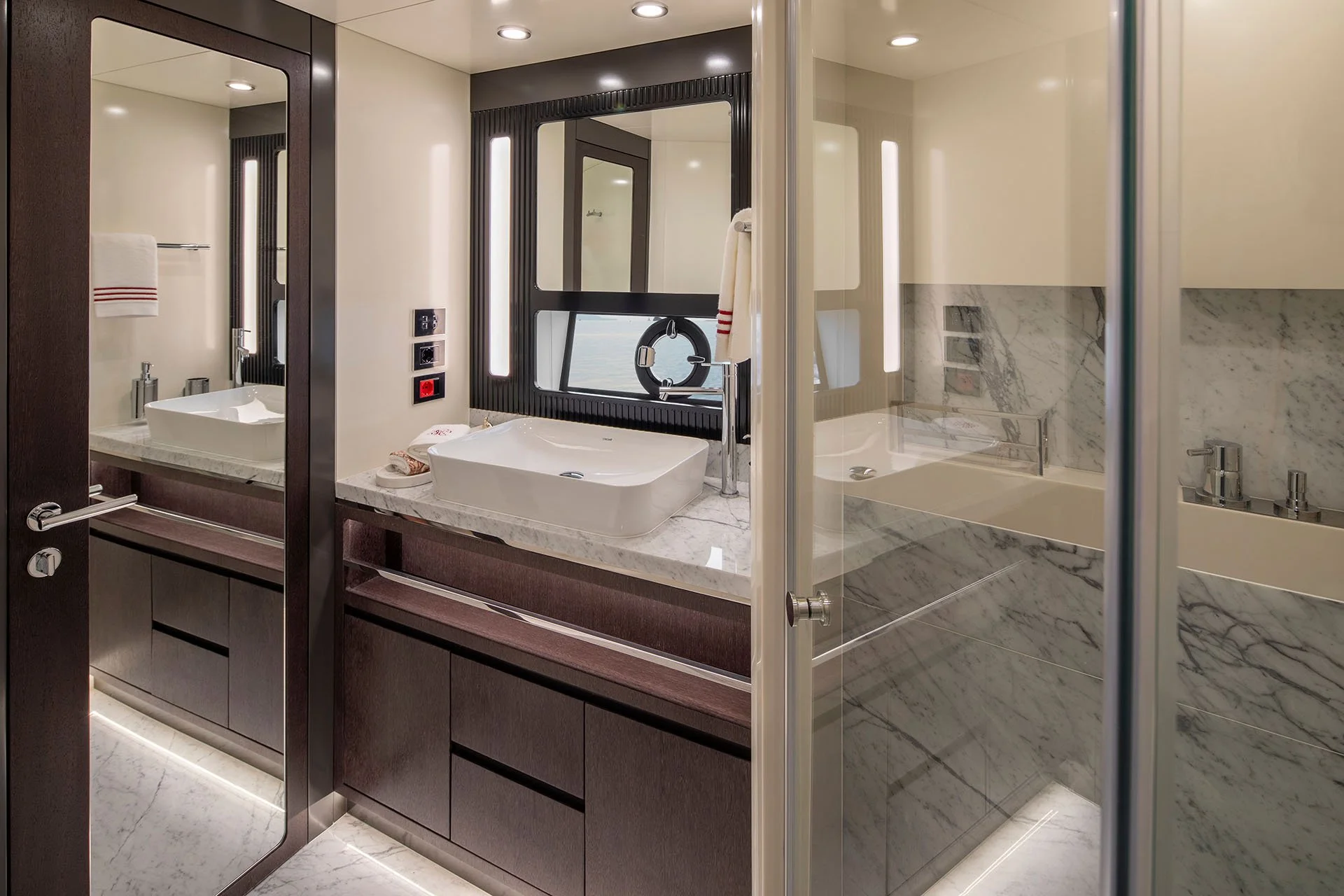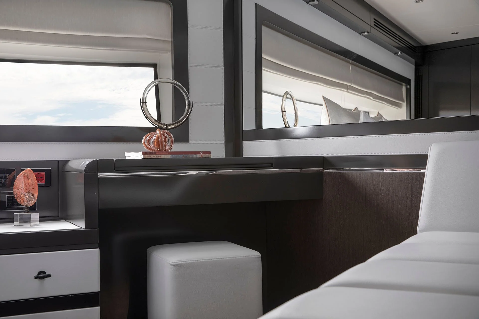The bold dark wood and anthracite lacquer create a very masculine and energetic look without being heavy A high contrast is created by the use of the finest white leathers and fabrics, resulting in an interior that feels stylish, yet contemporary and encourages you to push your limits... This modern look feels like an open loft and harmonizes with the colors of the yacht’s exterior..