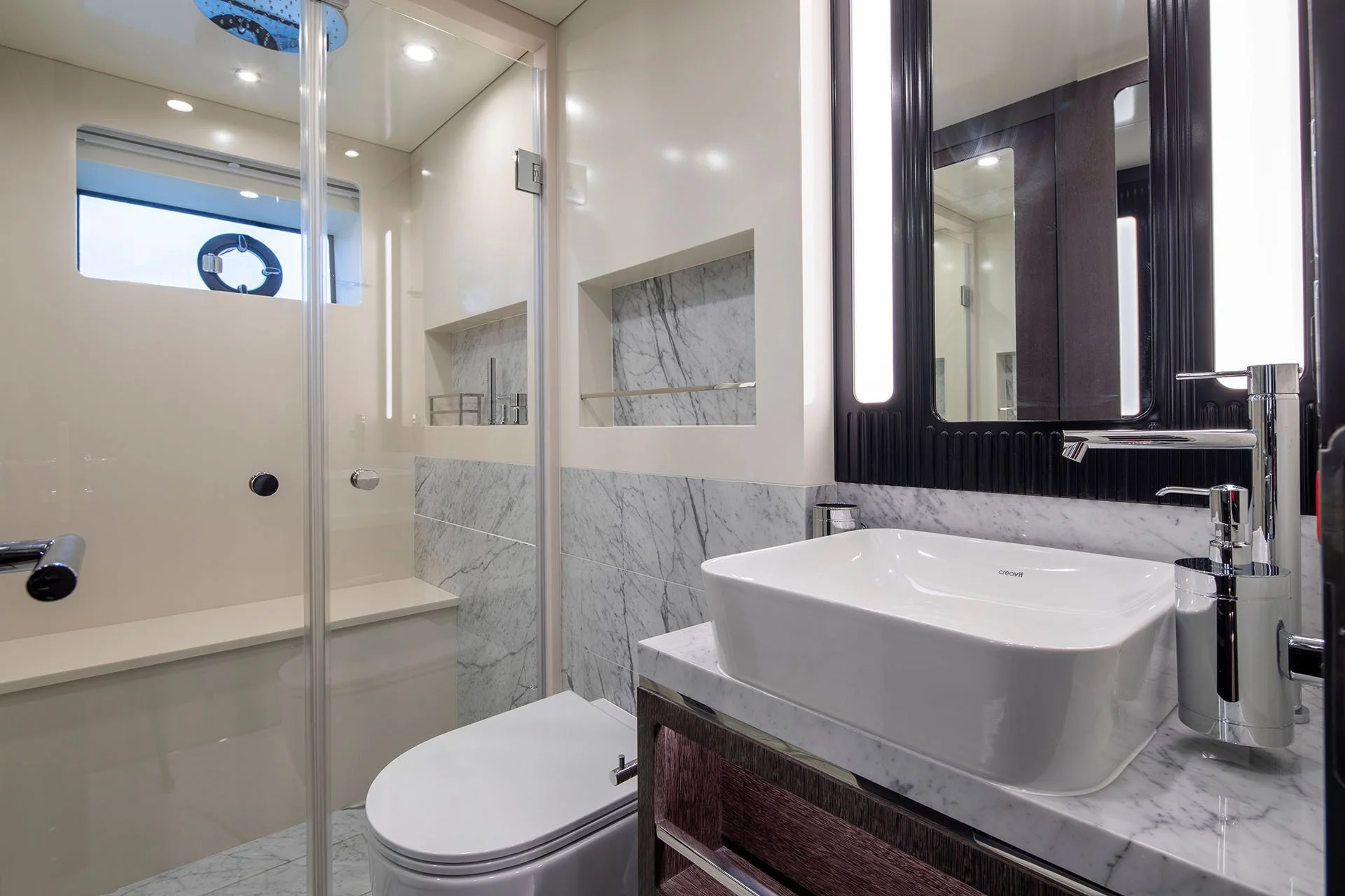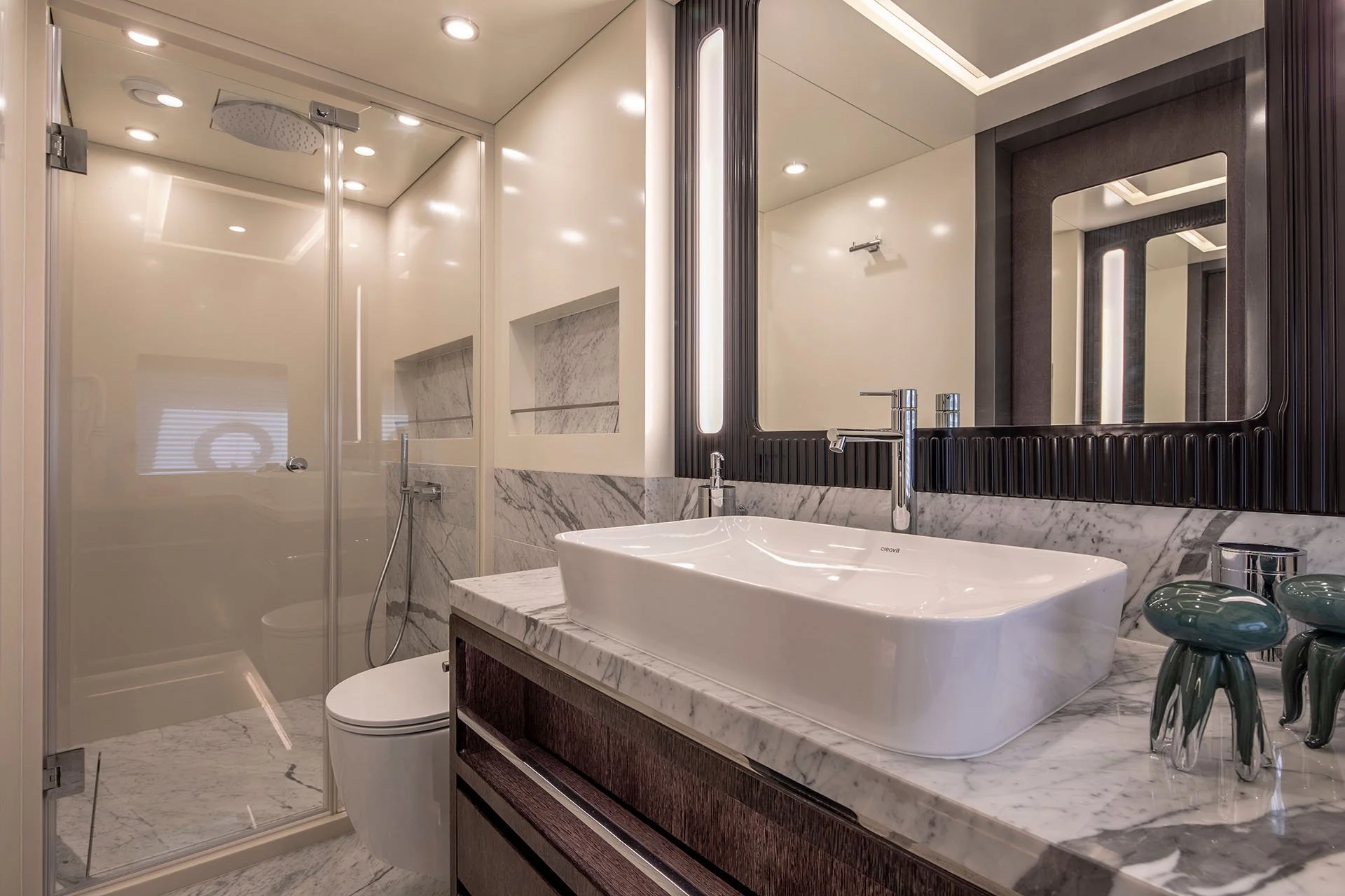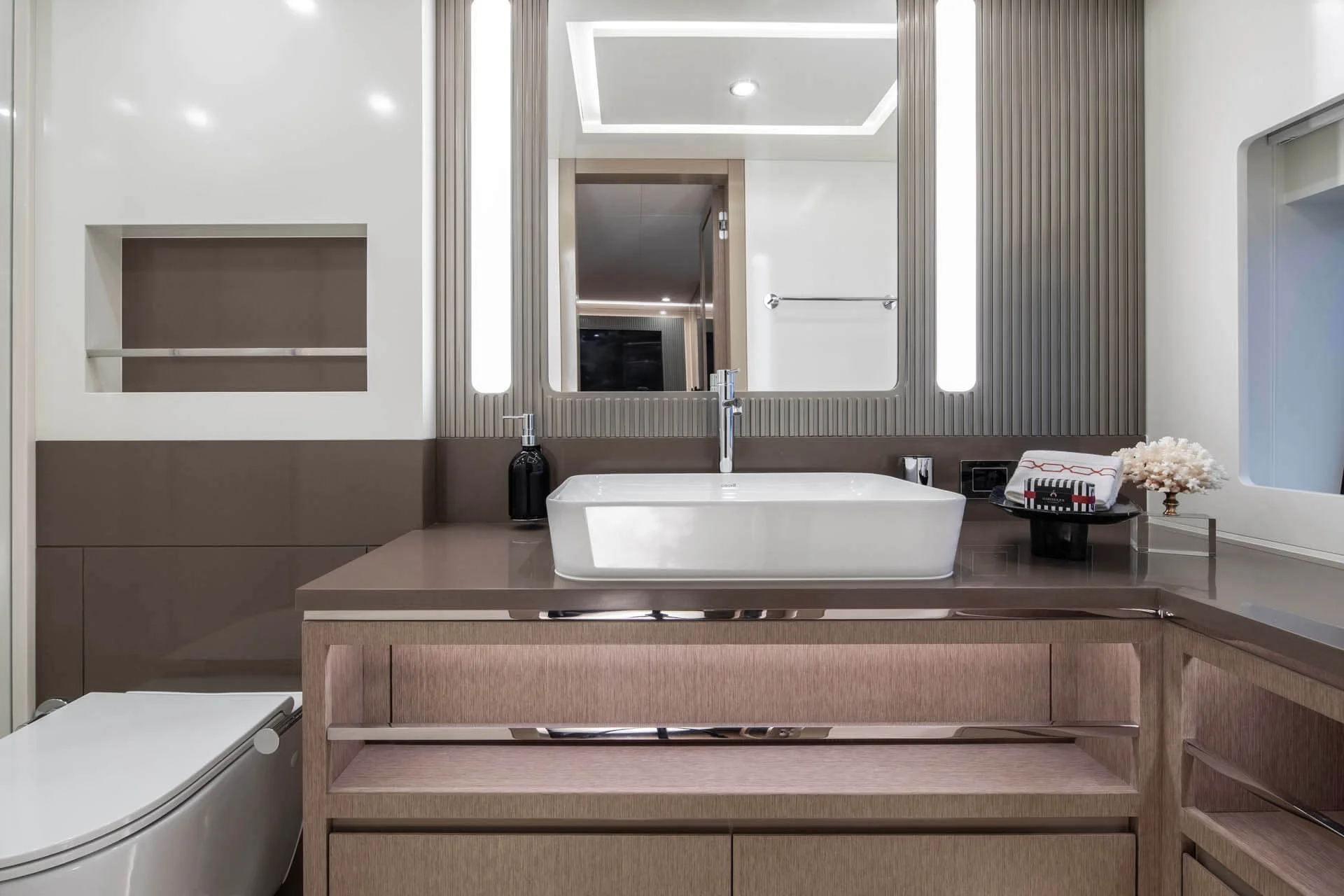 The bold dark wood and anthracite lacquer create a very masculine and energetic look without being heavy A high contrast is created by the use of the finest white leathers and fabrics, resulting in an interior that feels stylish, yet contemporary and encourages you to push your limits... This modern look feels like an open loft and harmonizes with the colors of the yacht’s exterior..