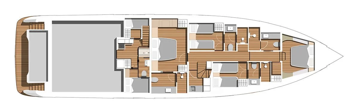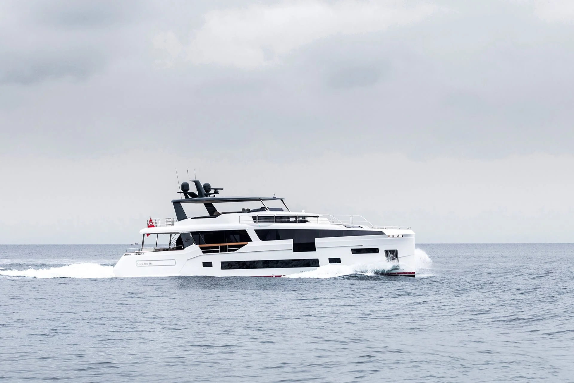 As a yacht suitable to take her owner and guests anywhere they wish to go, the Sirena 88 is truly an evolution of the designs used on her smaller sisters: her low-resistance, seakindly hull design brings efficient performance from her highest speeds to a long-range displacement cruise. Designed for dynamic stabilization and offshore passages, the yacht is meant to make the most of her cruising speed range of 2,000 nautical miles.
